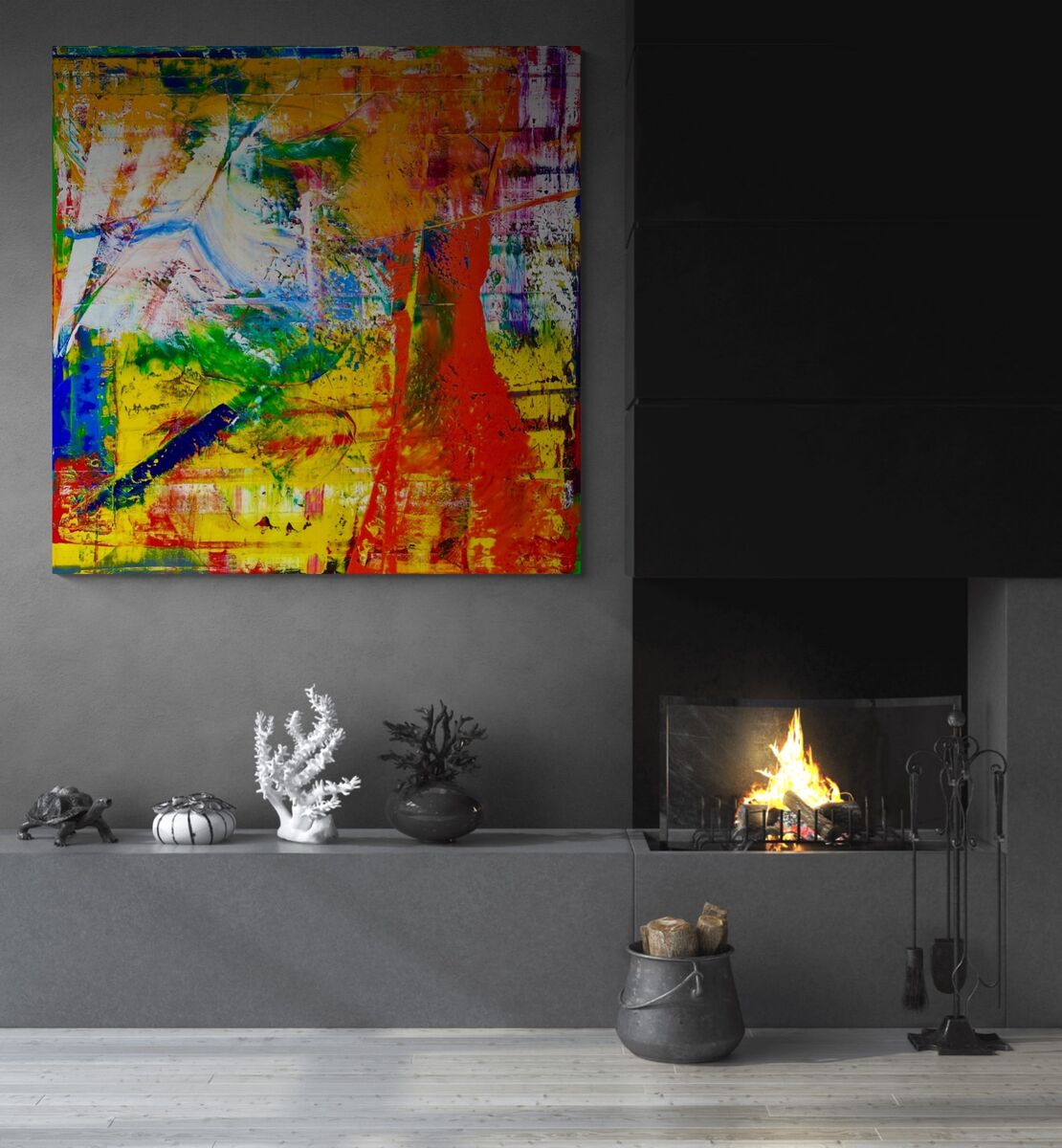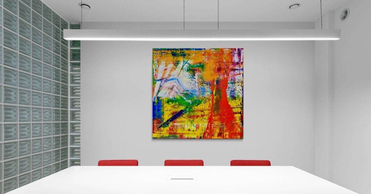Ich liebe quadratische Formate, und besonders grosse quadratische Formate. Dieses Bild ist auf einem Galeriekeilrahmen aufgezogen, welcher eine beeindruckende Tiefe von 5 cm hat. Daher wirkt das Bild noch wuchtiger, noch groesser, und ist noch schwerer als sonst. Ich haette gerne wieder mehr Grau verwendet. Mich hat aber dann doch wieder die Farbigkeit ueberwaeltigt. Dieses Bild spielt mit den Farben Gelb, Rot, Weiss und natürlich ein wenig Grau. Zumindest.