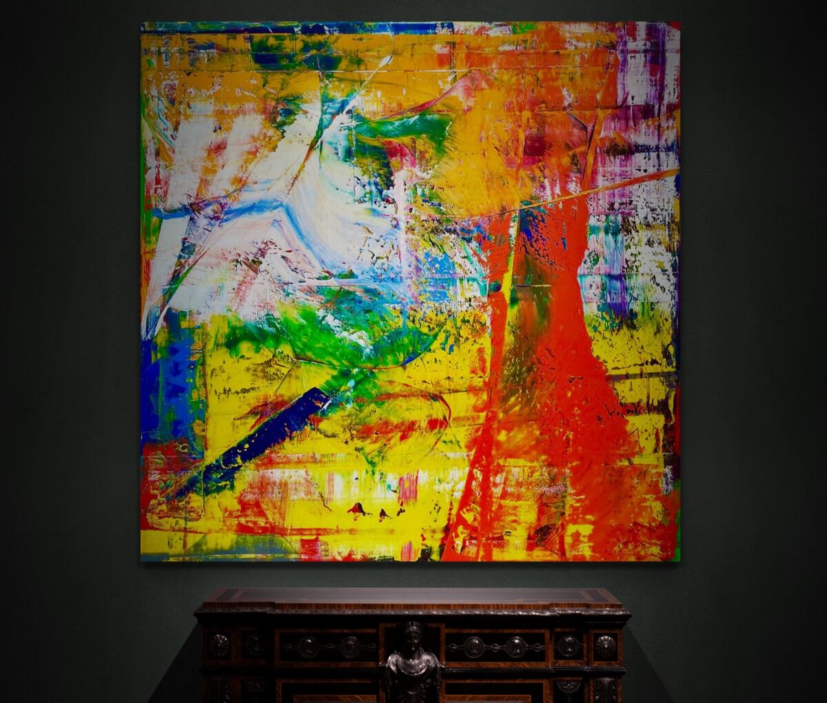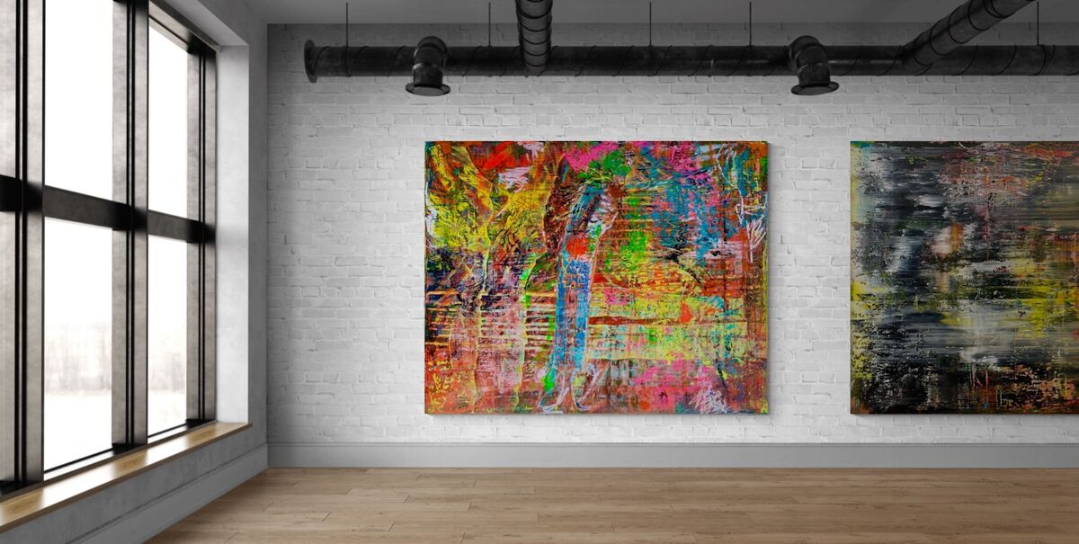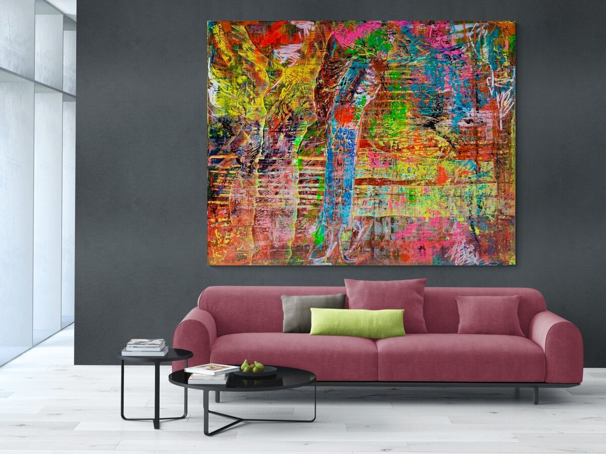 Nachdem ich kein Motiv plane, wenn ich zu malen beginne, waere es falsch zu behaupten, ich wollte eine meiner liebsten Wagner Opern in einem Grossformat darstellen. Aber auch dieses, wie so viele andere Grossformate, war ein schwerer Akt - wie jede Ring Oper. In dem Bild ist all die Tragik, die Schwere und das Schicksal der Goetterdaemmerung vereint. In der Wucht der Arbeit die Farbe mit Messern wieder abzutragen ist ein kleines Loch in der Leinwand entstanden, welches eigentlich nur von der Rückseite aus zu sehen ist. Macht das Bild nur noch besonderer!